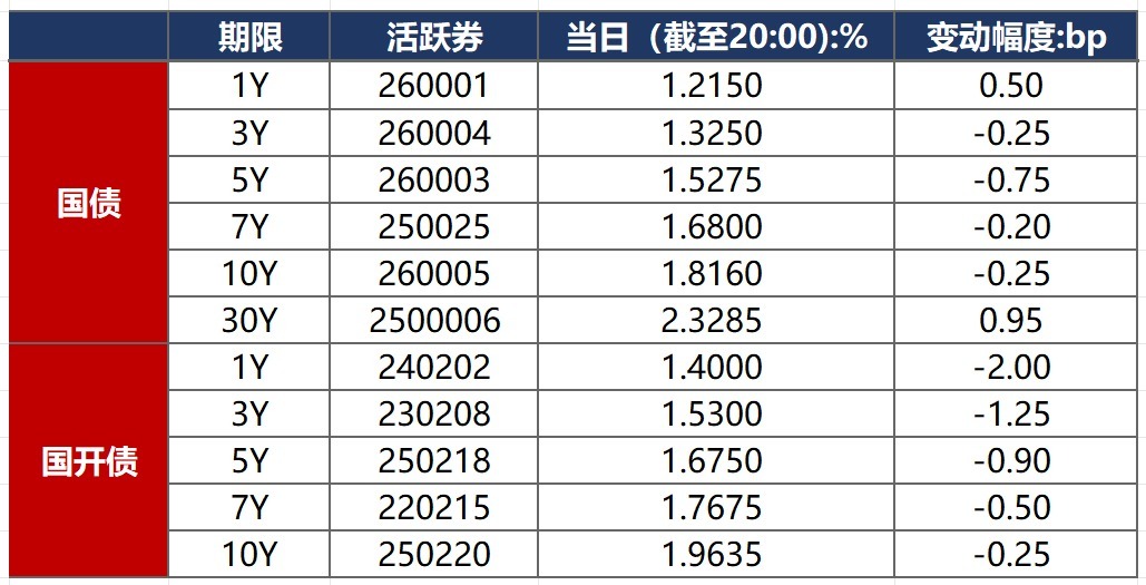 4月2日,美国总统特朗普讲话引发全球股市下跌,市场避险情绪升温,提振国内债市偏强震荡。截至北京时间20:00,10年期国债活跃券260005收益率下行0.25bp至1.8160%,10年期国开债活跃券250220收益率下行0.25bp至1.9635%。