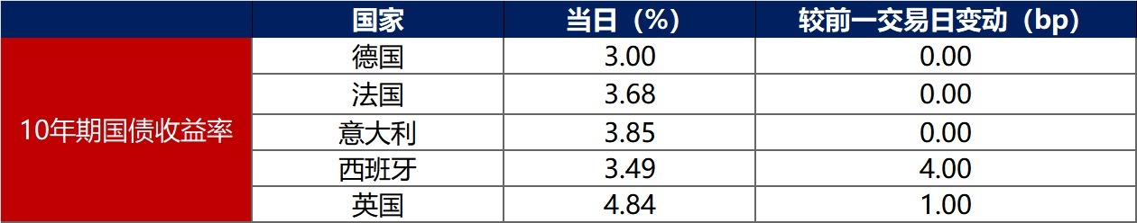 4月2日,主要欧洲经济体10年期国债收益率走势分化。其中,德国10年期国债收益率保持在3.00%不变,法国、意大利10年期国债收益率保持不变,西班牙、英国10年期国债收益率分别上行4bp和1bp。