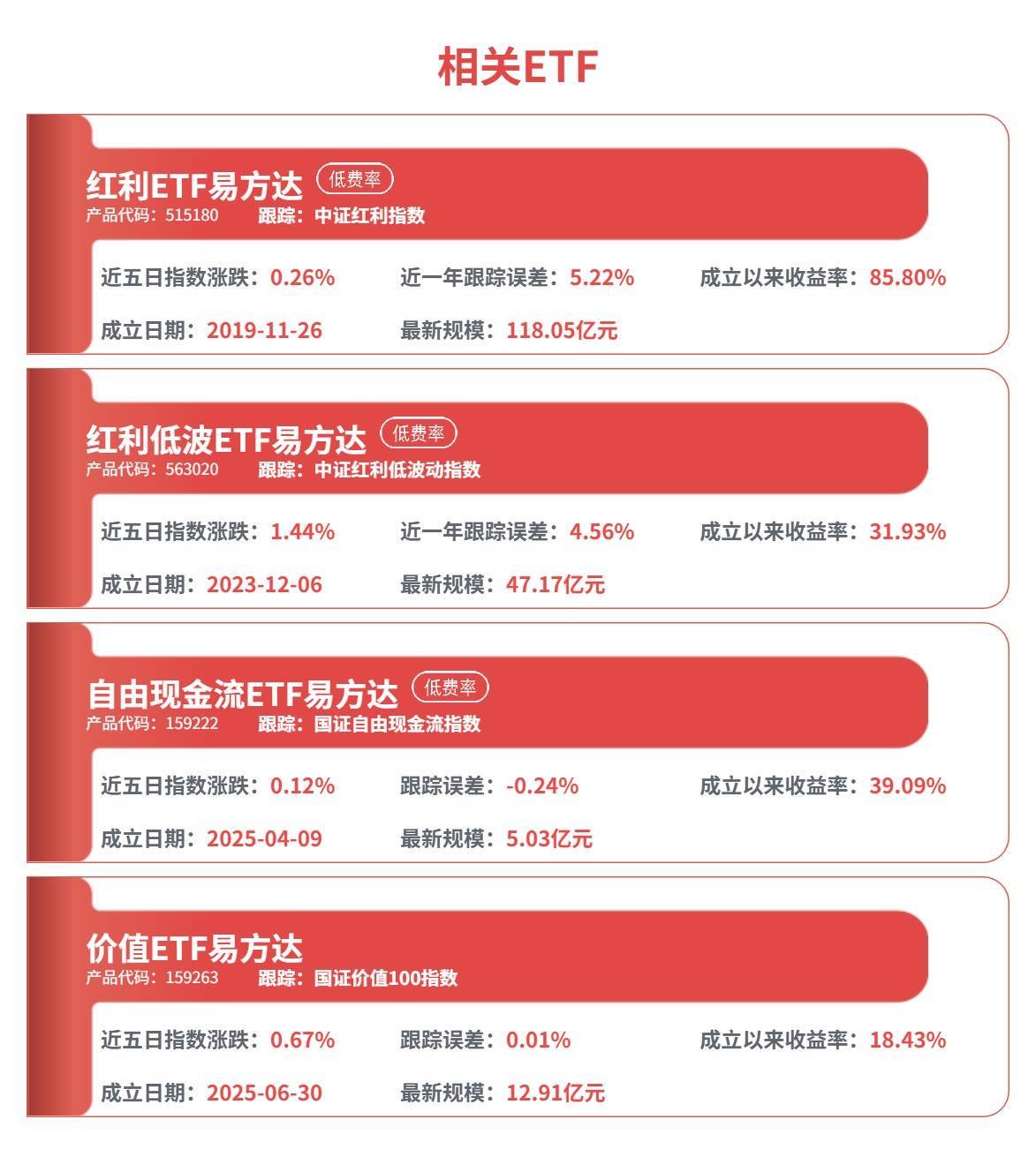 如果有股票账户的话,也可以布局场内的ETF,分别是红利ETF易方达(515180)、红利低波ETF易方达(563020)、自由现金流ETF易方达(159222)和价值ETF易方达(159263)。